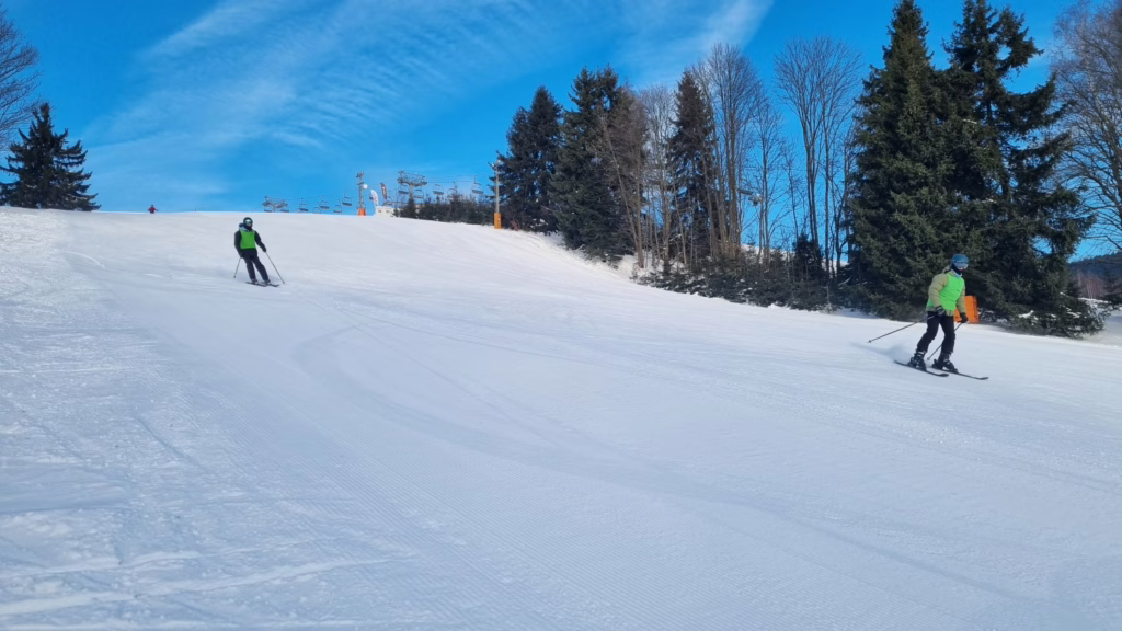 Hned po příjezdu nás přivítaly skvělé sněhové podmínky. Sjezdovka byla perfektně upravená, hladká a bez ledových ploten, takže si na ní užili jak začátečníci, tak pokročilí lyžaři. A co bylo snad ještě lepší – žádné fronty. Většinu času jsme jezdili prakticky bez čekání.