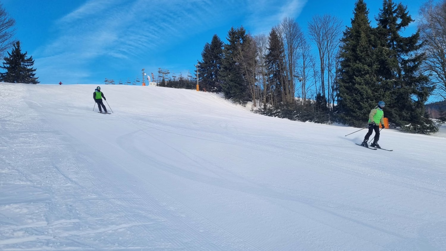 Hned po příjezdu nás přivítaly skvělé sněhové podmínky. Sjezdovka byla perfektně upravená, hladká a bez ledových ploten, takže si na ní užili jak začátečníci, tak pokročilí lyžaři. A co bylo snad ještě lepší – žádné fronty. Většinu času jsme jezdili prakticky bez čekání.
