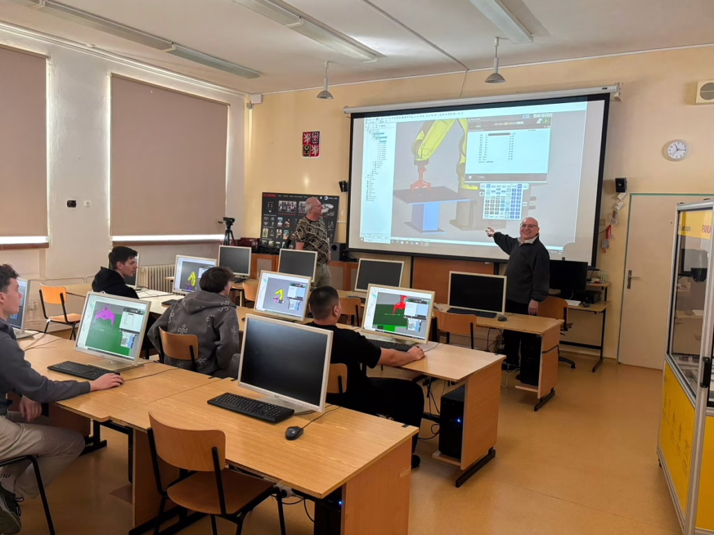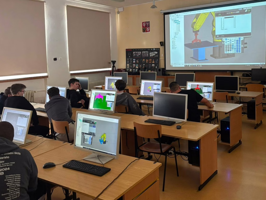 Na naší škole proběhla výuka žáků SŠP Vyškov. Devět žáků se pod vedením učitele Ing. Jiřího Hanáka učilo pracovat s robotickou rukou FANUC a programovat v simulačním programu ROBOGUIDE.