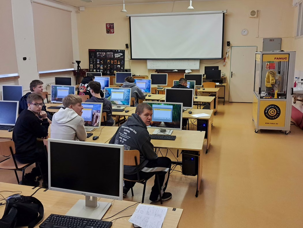 Na naší škole proběhla výuka žáků SŠP Vyškov. Devět žáků se pod vedením učitele Ing. Jiřího Hanáka učilo pracovat s robotickou rukou FANUC a programovat v simulačním programu ROBOGUIDE.