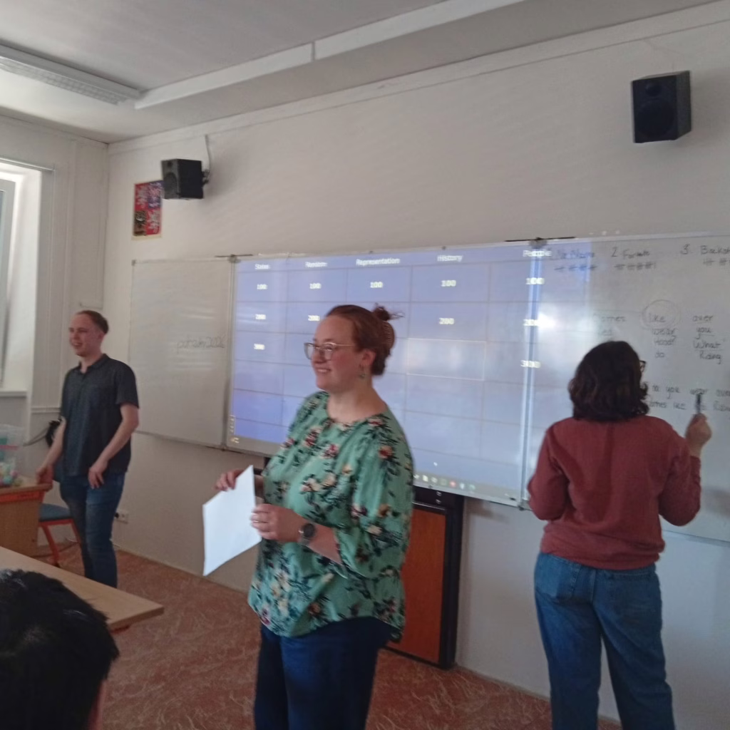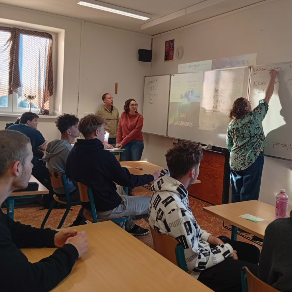 Žáci si vyzkoušeli různé konverzační aktivity, zasoutěžili si a také zhlédli krátkou prezentaci o „ Word of life“, táboru ve kterém všichni tři pracují a dostali pozvánku s možností v létě do tábora přijet a zdokonalit se v angličtině i různých sportech.